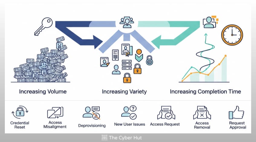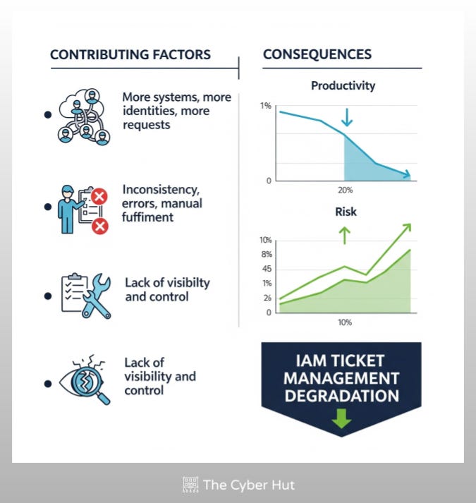 Many of these requests are repeatable, routine and avoidable - yet are still being completed by human operators. Requests often lack the appropriate level of context and detail - missing basic details such as the user’s current role or access, a system owner or a more risk-aligned description of what is needed and why.